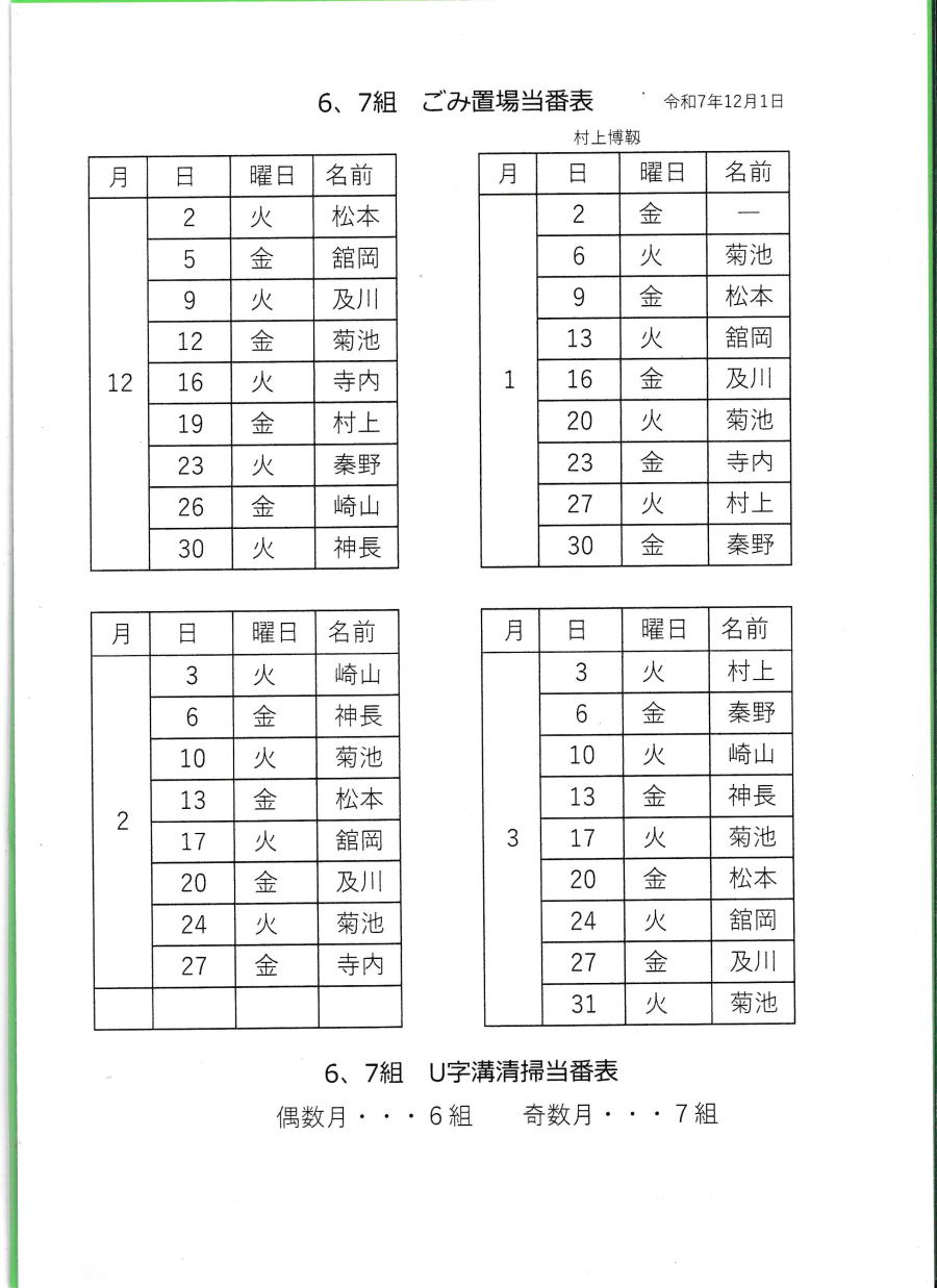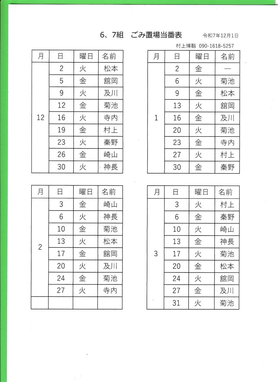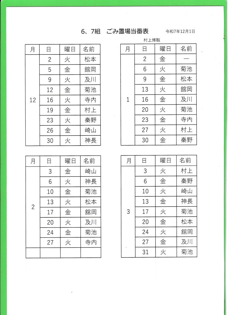 ごみ収集置場当番表