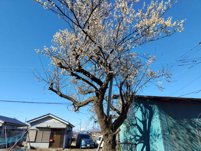 2026年2月5日いち早く咲いた古木の梅。後ろに富士山が見える